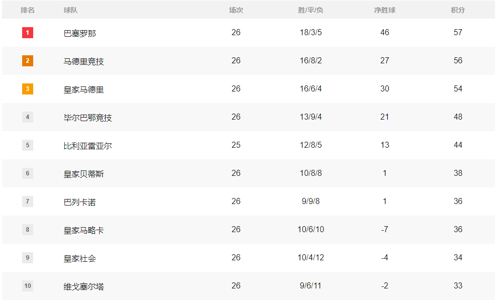 北京时间3月3日,西甲第26轮几乎战罢,仅剩比利亚雷亚尔VS西班牙人一役,积分榜情况如下: