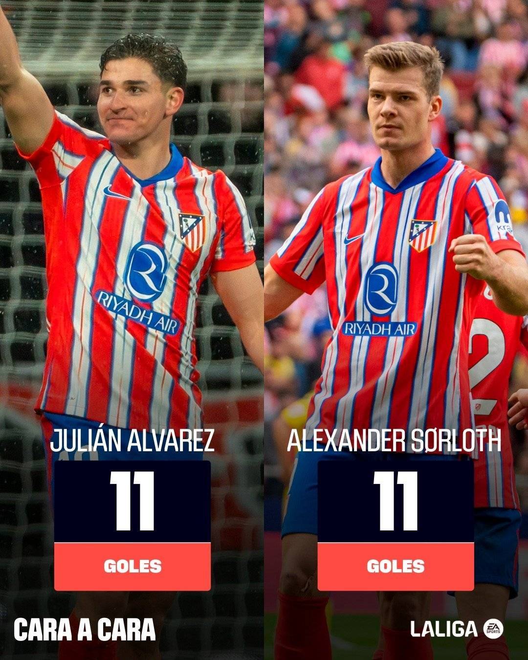 直播吧03月22日讯 西甲官方晒出了马竞两位前锋的数据,在28轮的西甲比赛中,阿尔瓦雷斯和索尔洛特各打入了11球。