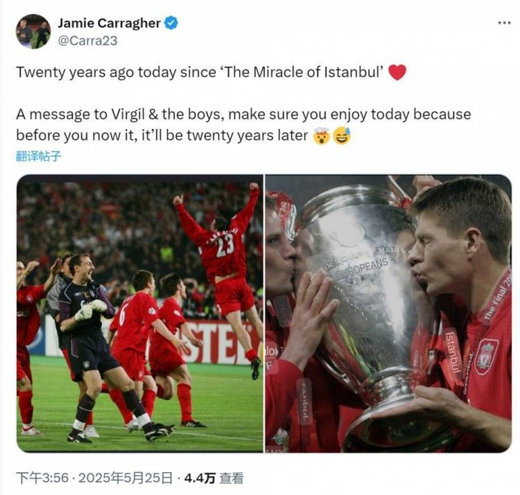 直播吧5月25日讯 利物浦名宿卡拉格更新社媒动态,回顾伊斯坦布尔奇迹。